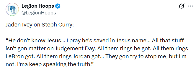艾维随后在社交媒体上直播,谈到库里时他表示:“他不认识耶稣……我奉耶稣的名祷告,愿他得救……在审判之日,所有这些事情都不再重要。他拥有的所有戒指,勒布朗拥有的所有戒指,乔丹拥有的所有戒指……他们会试图阻止我,但我不会停下。我将继续传扬真理。”